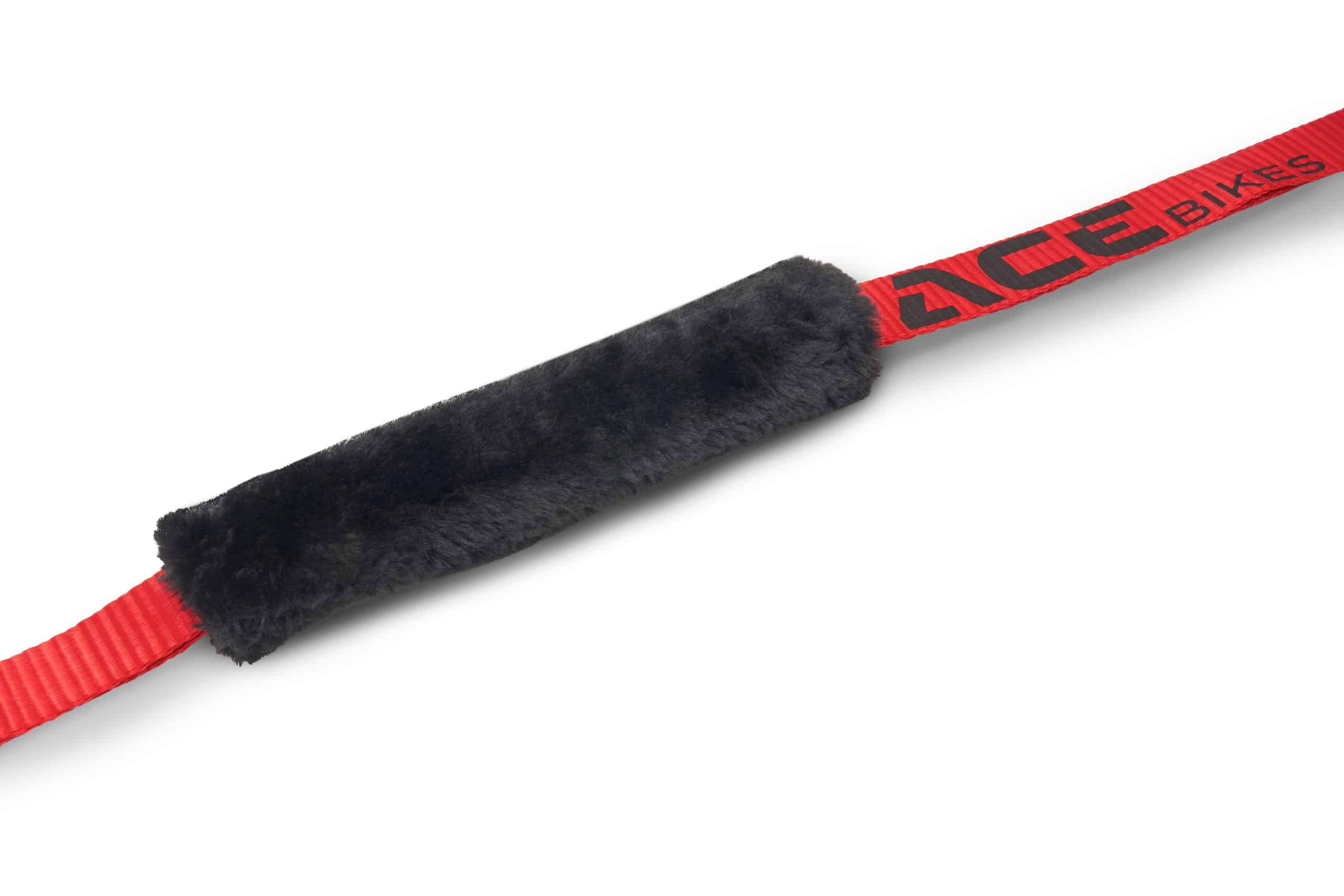 The Buckle-up is an integrated handlebar harness, complete with sheep’s wool protector and handlebar loops. All this is attached to the 360 cm long and 35 mm wide polyester belt. A sturdy piece of attachment material, if you ask us. The ends are formed by two plastic coated hooks with locking clips. The straps are tightened with galvanized buckles, one on each end.