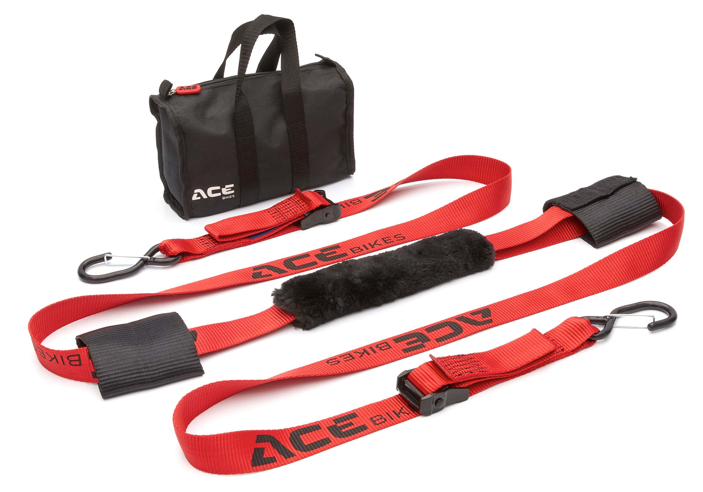 This Buckle-Up from Acebikes is an ‘all-in-one’ strap to quickly fasten your motorcycle on a trailer. Here the focus is on the handlebars.