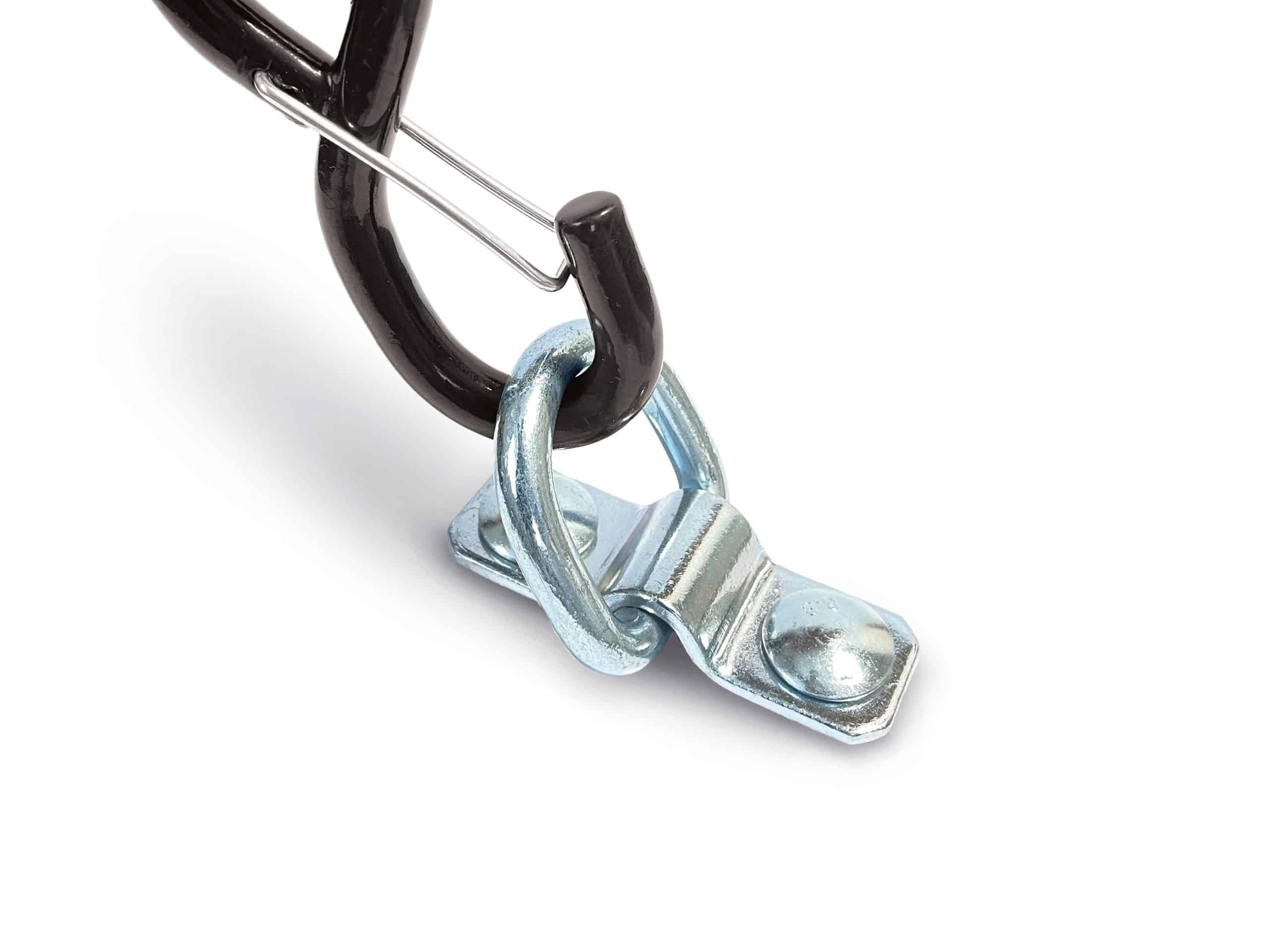 The D-rings are to be installed in a trailer or cargo space, which is simplified by two predrilled square holes. When you’re not using them, you can simply lay them flat so that they are not in the way. All of the fixing material is delivered: two sturdy nuts (M10, 40mm) per ring with washers and flat-headed screws.