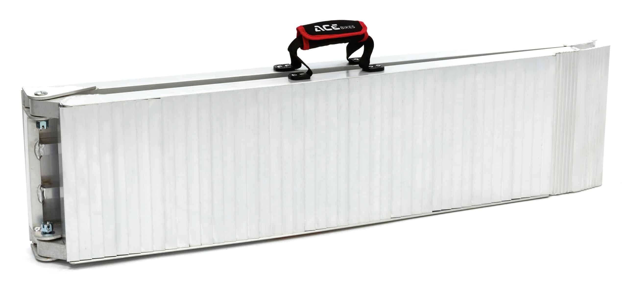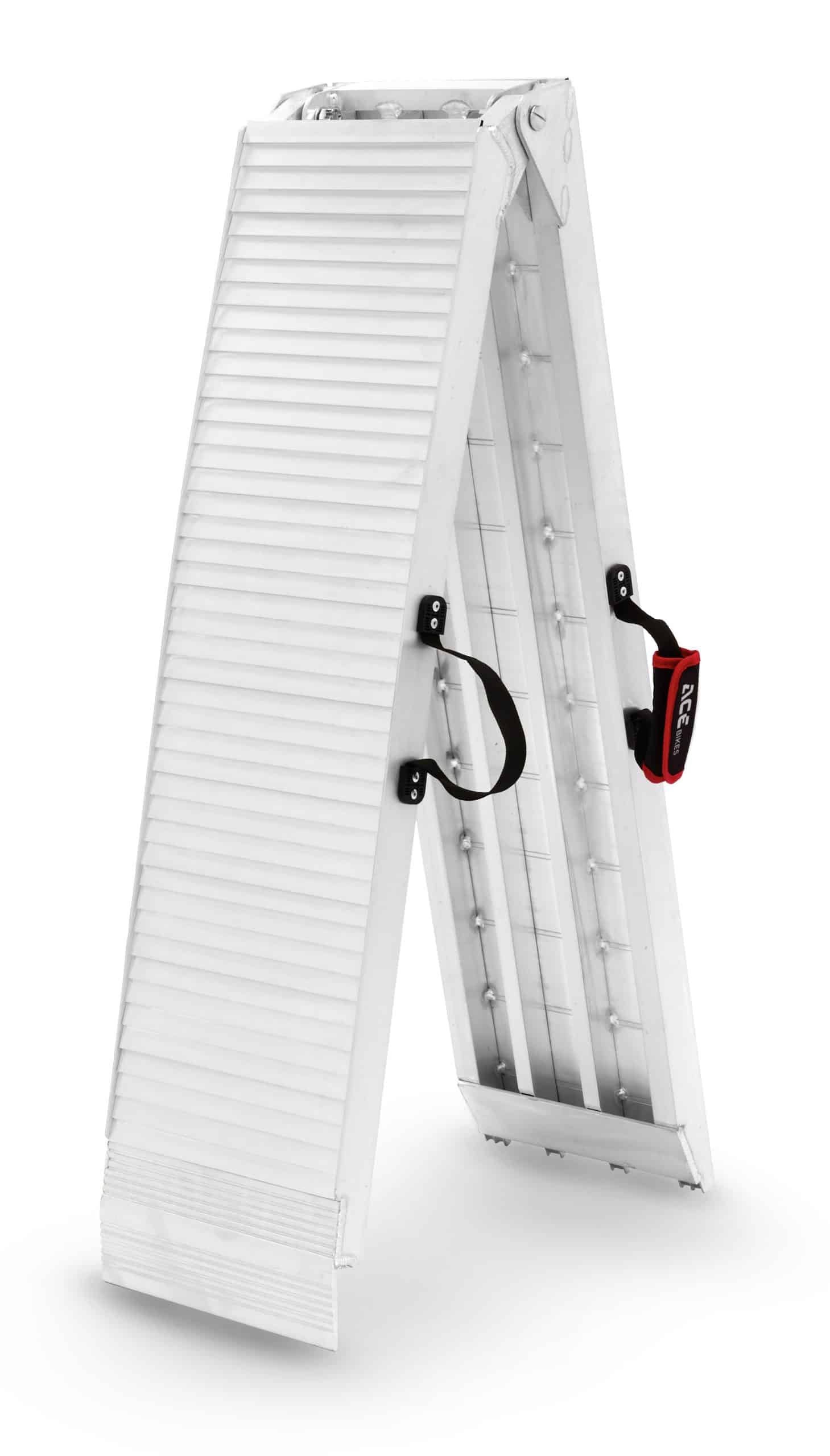 Of course, you wouldn’t do it that way. We have a safer solution to help you. This robust ramp allows for safely loading of your motorcycle on a trailer or in a van. The Acebikes ramp has reinforced side beams and heavy duty hinges. It is made of aluminium and has a relieved surface for extra grip. The lightweight ramp only weighs 12 kgs and is easy to fold up and store in the ACEBIKES carrying bag.