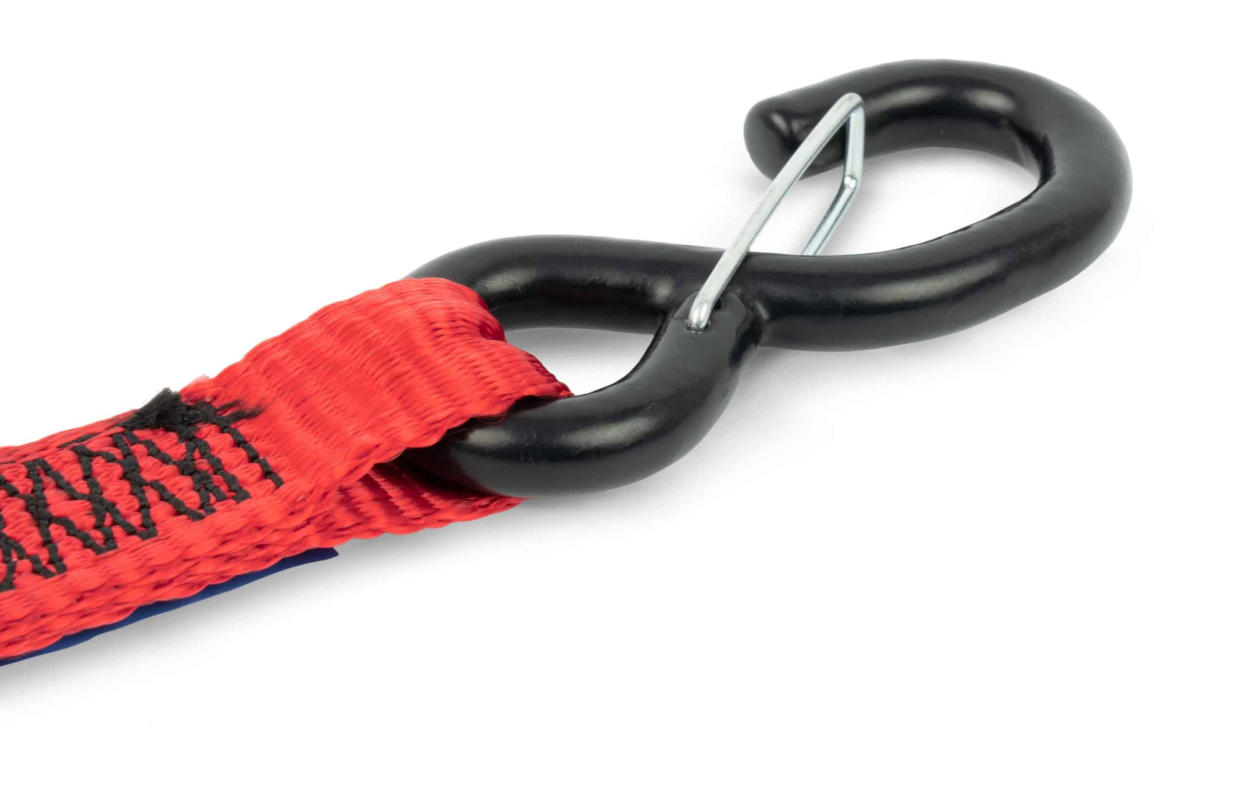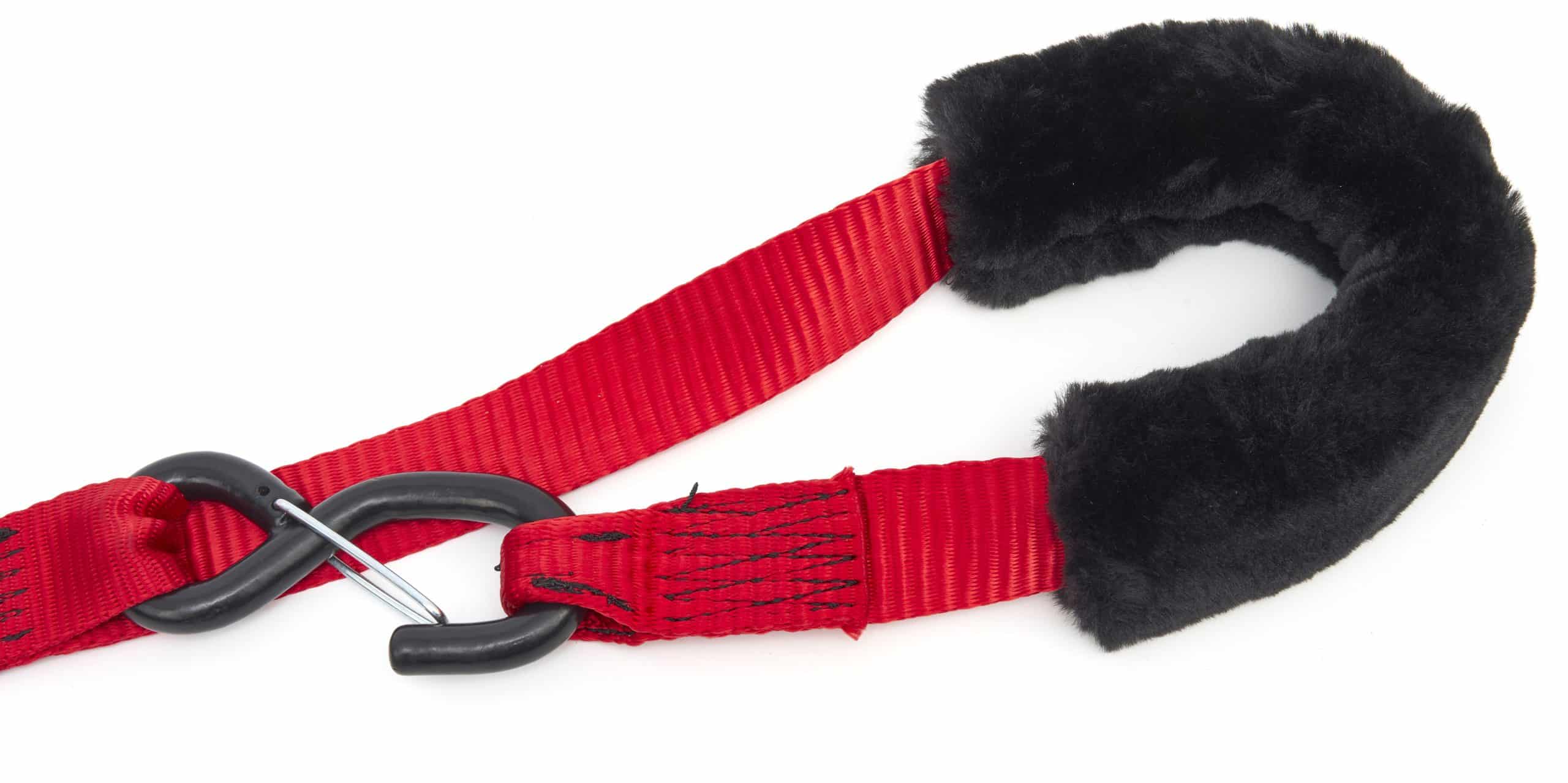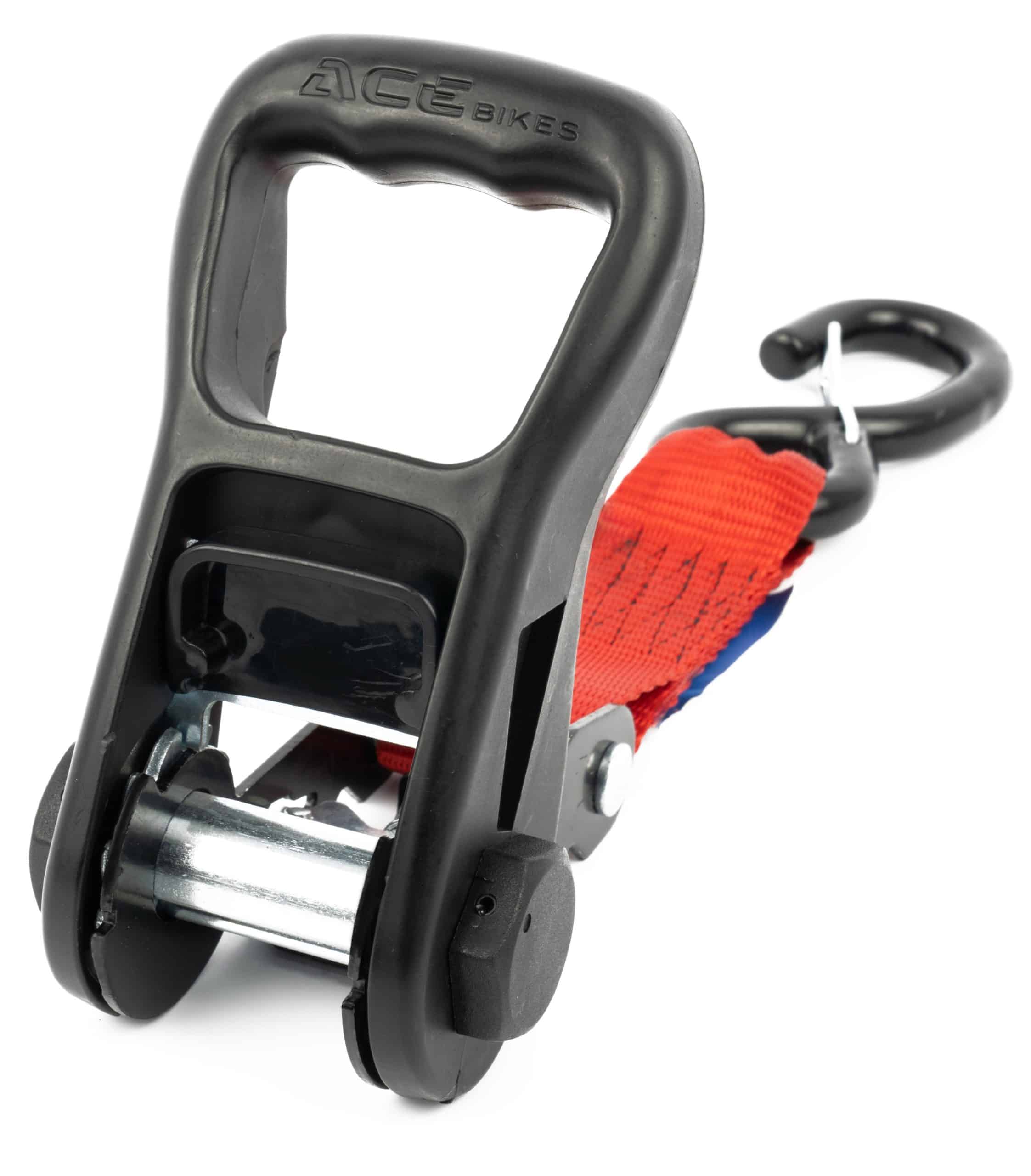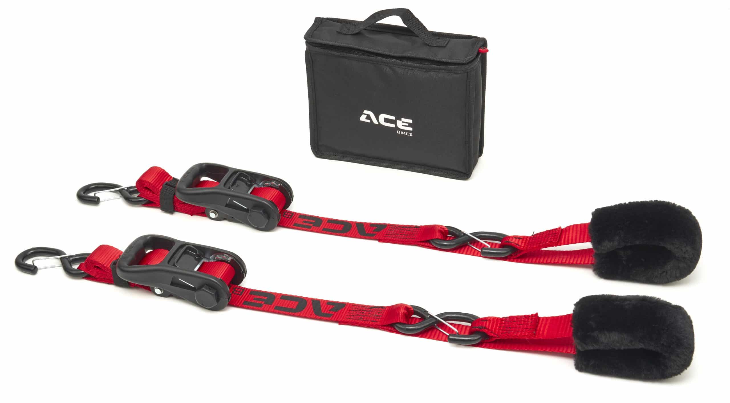 The Acebikes ‘Ratchet Premium Deluxe’ kit is everything you need, and it comes in a handy storage bag. Two sturdy polyester straps, with as many ratchet tensioners. The loops at the end are covered with protective covers made from sheep’s wool to protect chromed or painted parts. Heavy-duty plastic hooks have a closure to ensure that everything remains safe and sound when attaching them.