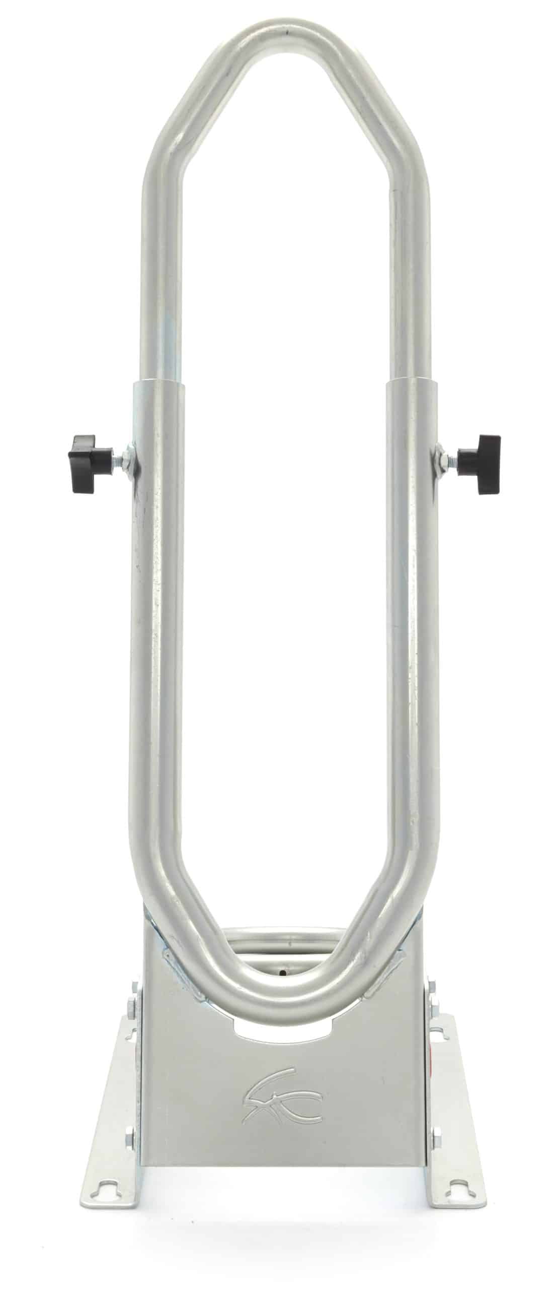 This model is specifically developed to be fixed to the floor of a trailer or van. The wheel clamp can be assembled in two different ways: with the attachment points facing outwards for a wider ground plane, or with the attachment points inwards for a narrower ground plane.