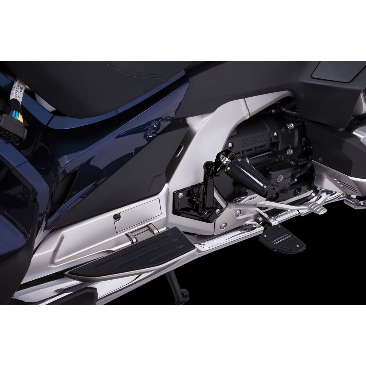 | The Goldstrike™ Adjustable Passenger Pegs allow you to provide your passenger with a wide range of foot positions to ensure an extremely comfortable ride. These mounts simply bolt to the frame of your motorcycle with no modification and feature strong, rigid construction paired with elegant styling. The Rail peg is also included which rests perfectly in the arch of your foot with a slight kick up on the end to make sure your foot is secure and doesn’t slide off. Will not fit on trike conversions with solid swingarm pivot shaft. Features: