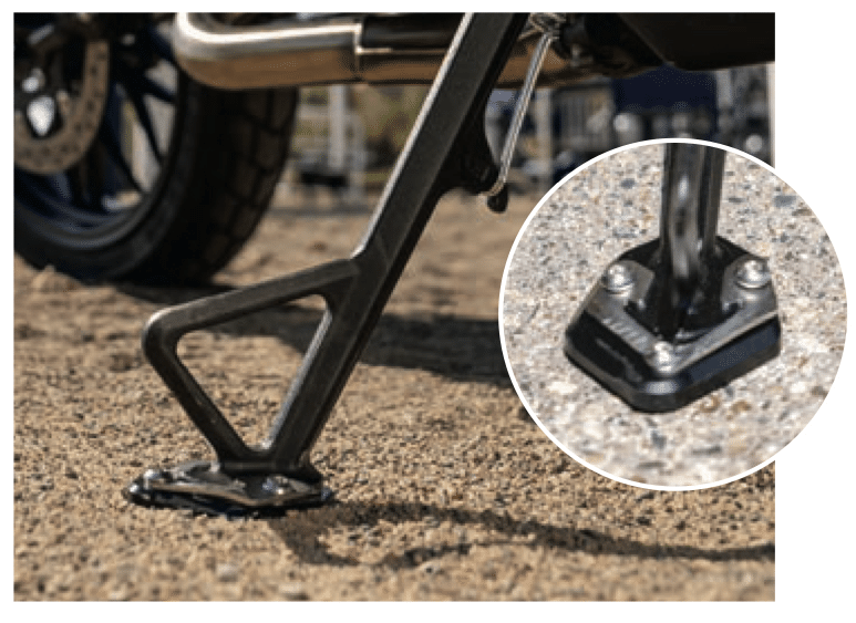 - Increase the footprint of the side stand and improve the stability of the bike when parking on loose surfaces or hot asphalt