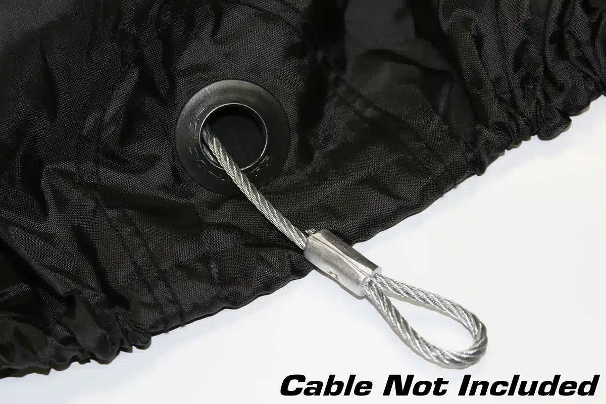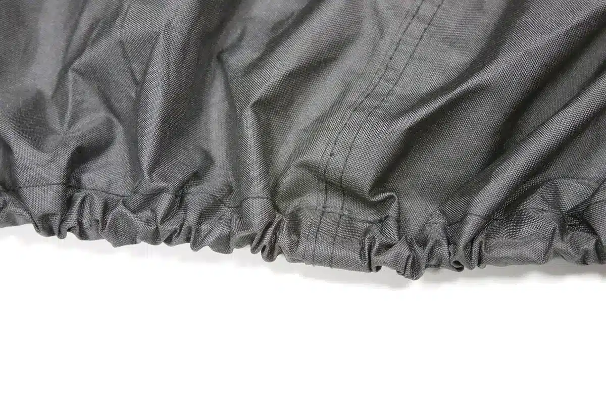 - Snug elastic hem and quick-release belly strap secures cover to bike