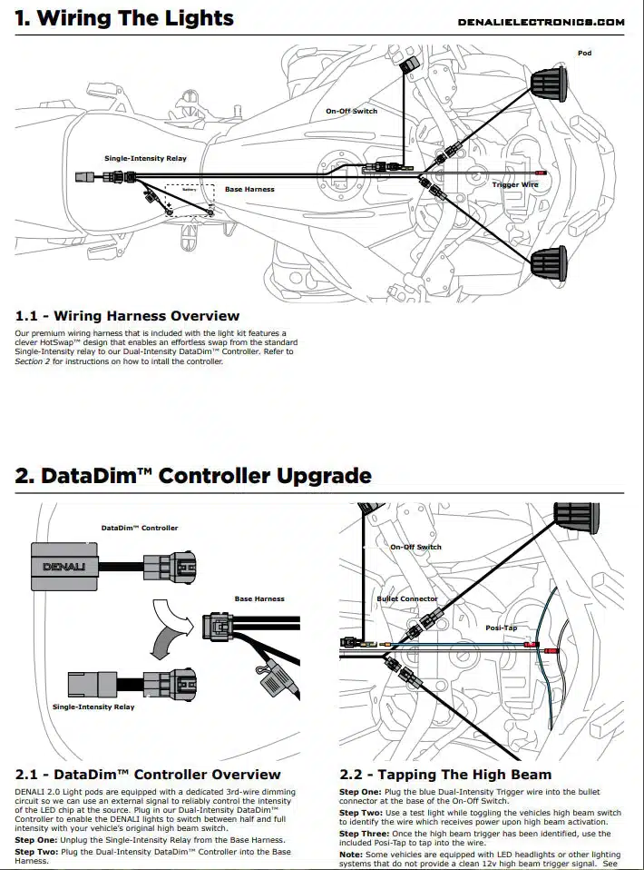 Fitment Note: Vehicles equipped with LED headlights may utilize a ground switched circuit, which will not trigger the DataDim’s function with the factory high beam controls. Vehicles with ground switched headlights will require the DENALI 2.0 DrySeal™ Hi-Low-Off Waterproof Switch in addition to the DataDim™ to toggle between high beam and low beam.