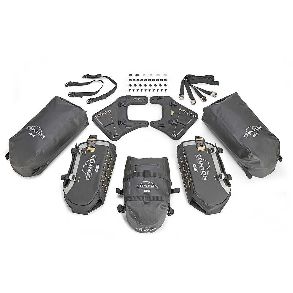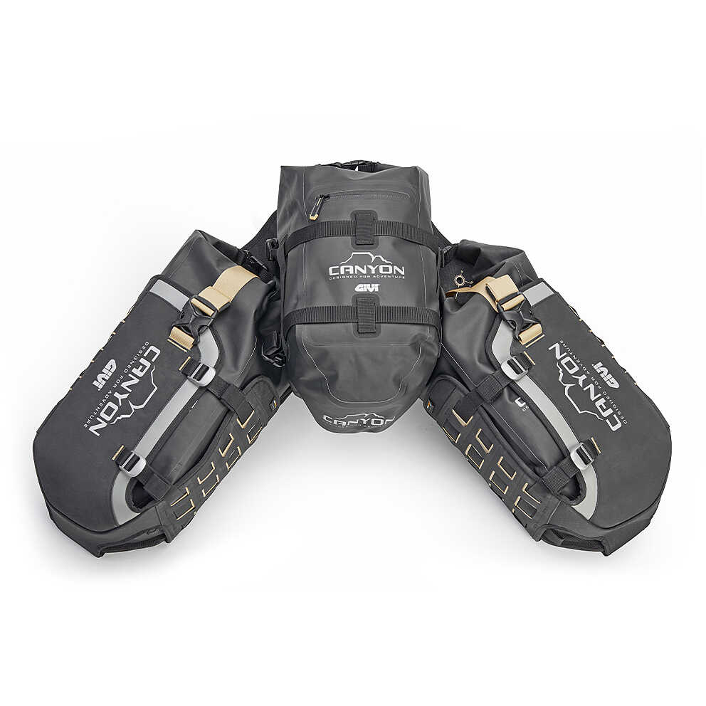 Two 16-litre waterproof side bags and a 12-litre waterproof central bag are arranged laterally, offering a total load capacity of 44 litres. Thanks to the MOLLE system present on all the bags in the range, it is also possible to further increase the load by adding, for example, the GRT730 bag which can hold tools or two water bottles. In this way, it is possible to best adapt the configuration of the motorbike based on your travel needs, from short off-road itineraries to great adventures around the world.