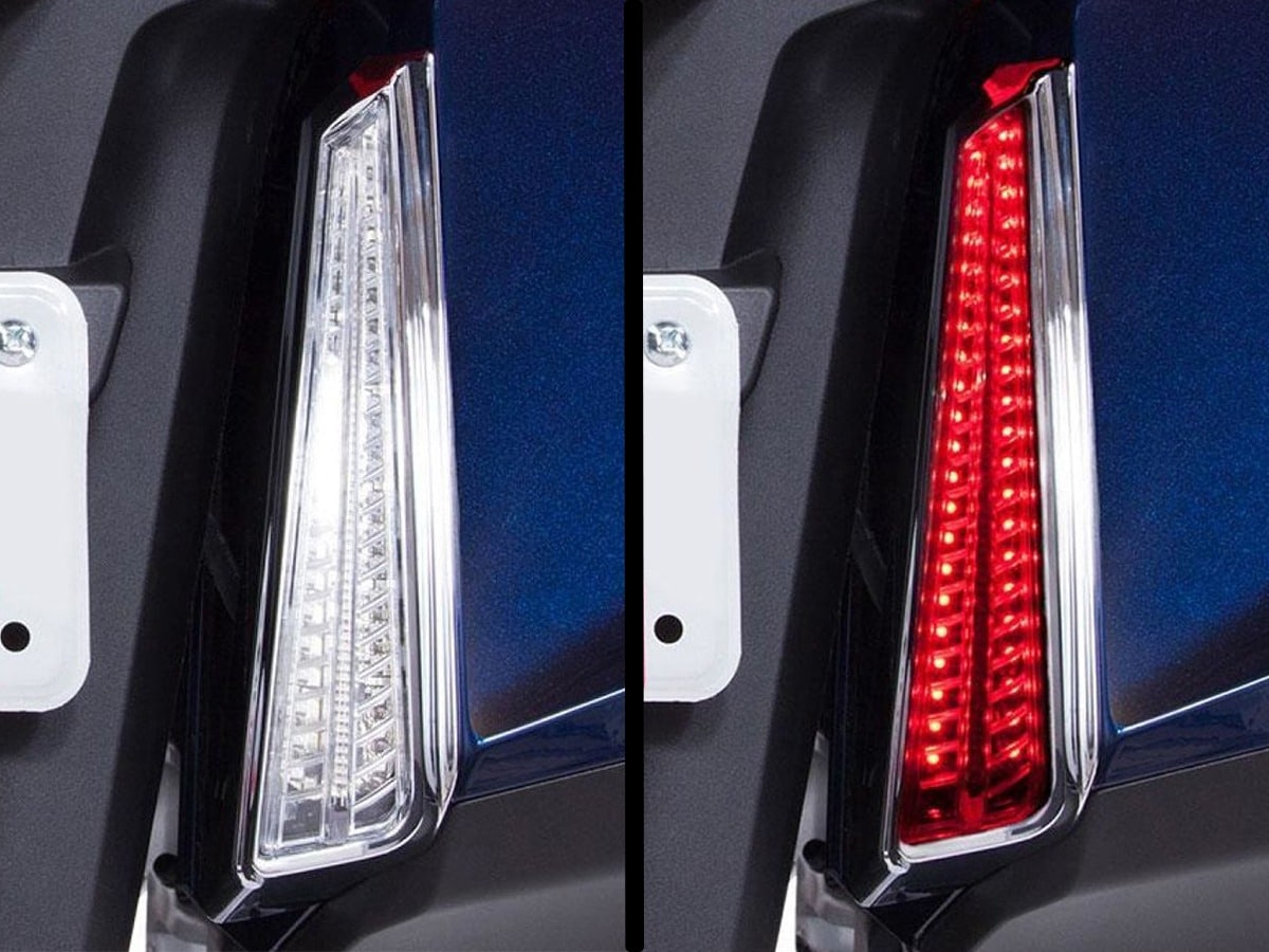 The Goldstrike Filler Panel Lights add super bright LEDs to the back of your bike to help be sure you’re seen. Featuring high intensity plasma amber turn signals, red run and brake lights. Light-pipe technology and ground breaking optics allow for visibility even when viewed from a sharp side angle. These are a must for any rider.