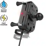• Waterproof Qi compatible wireless phone charging cradle features spring-loaded RAM® X-Grip® technology and 10W maximum output