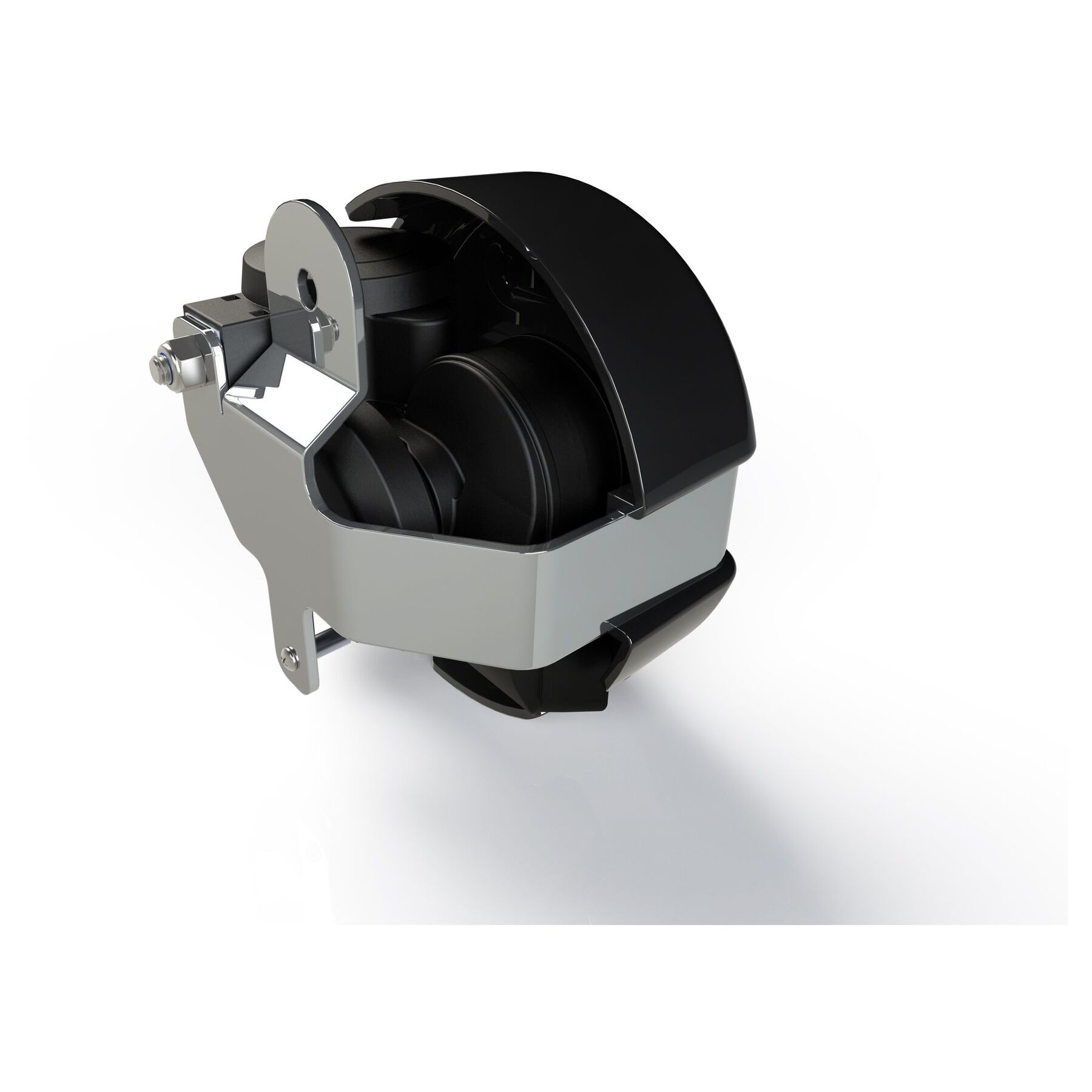 This unique horn cover with integrated mounting bracket was specifically designed for installing the Denali Soundbomb Compact Air Horn in the factory horn location on many V-Twin motorcycles. The stylish gloss black ABS shell and chrome plated steel bracket mounts and hides the 120+ decibel SoundBomb Compact Horn on your bike.