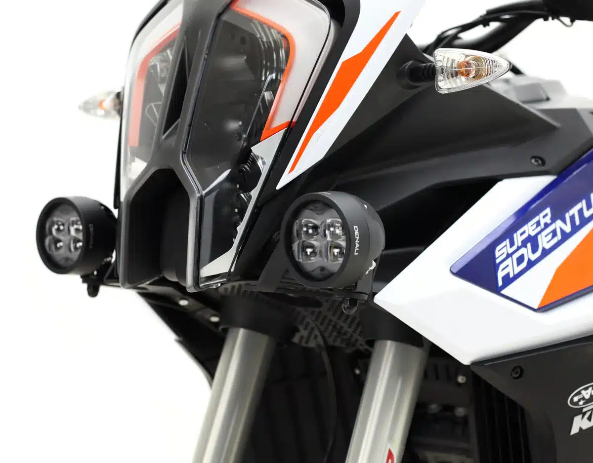 This vehicle-specific driving light mount allows you to mount any DENALI driving light in the optimum upper location on your motorcycle. This kit includes beefy powder coated steel brackets with and M8 mounting hole and all necessary mounting hardware.